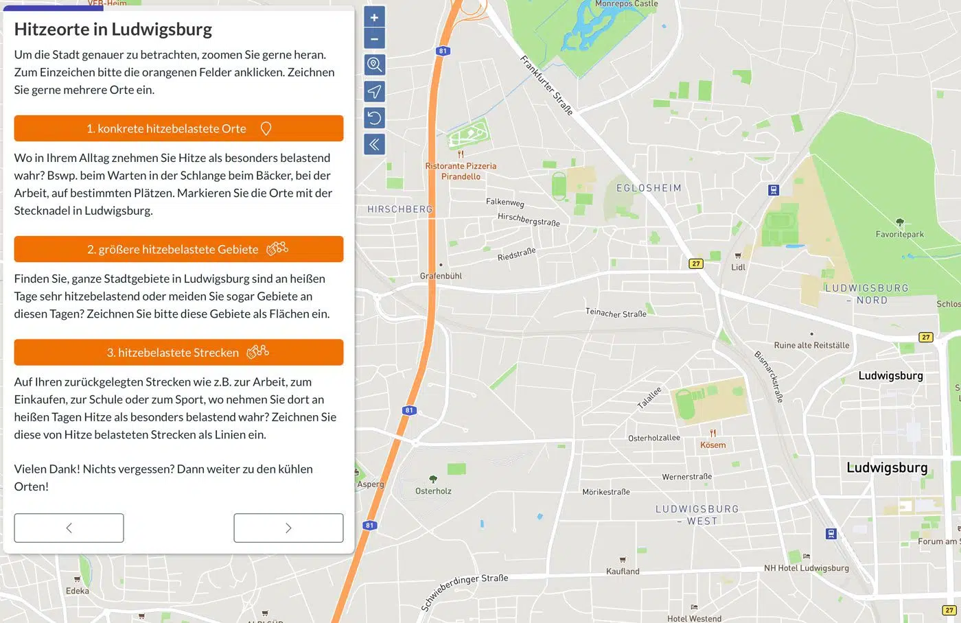 Wir wollen gerne mehr über Ihre Erfahrungen an heißen Tagen in der Stadt Ludwigsburg wissen. Wo nehmen Sie Hitze in der Stadt besonders als unangenehm wahr? In welchen Alltagssituationen stört Sie die Hitze besonders? Welche Orte suchen Sie in Ludwigsburg auf, um sich abzukühlen?