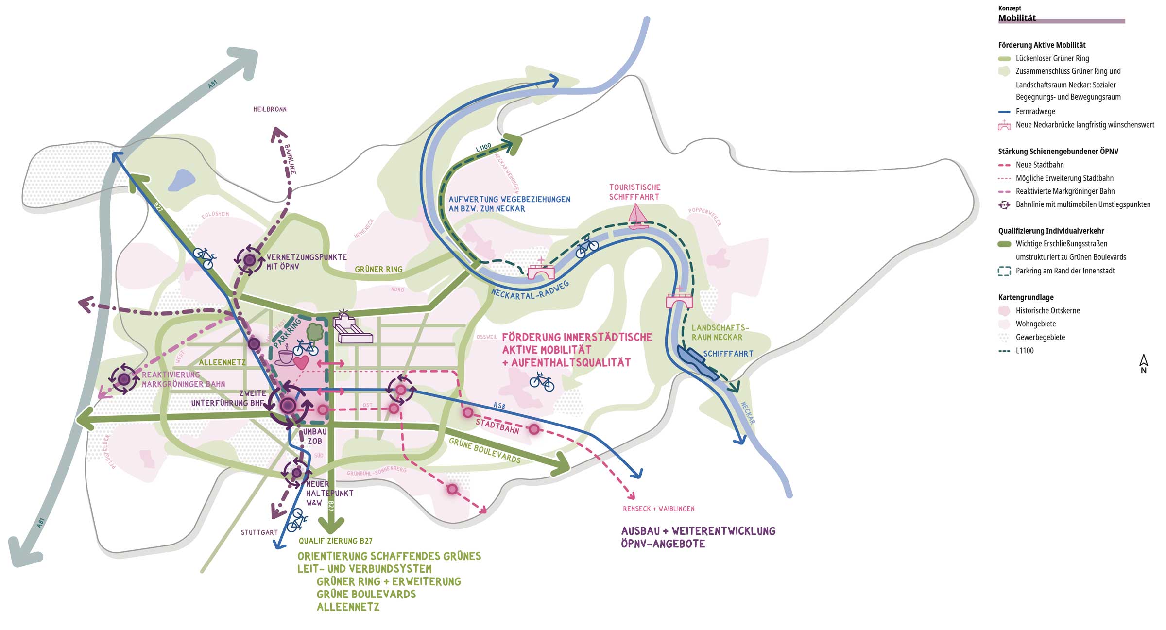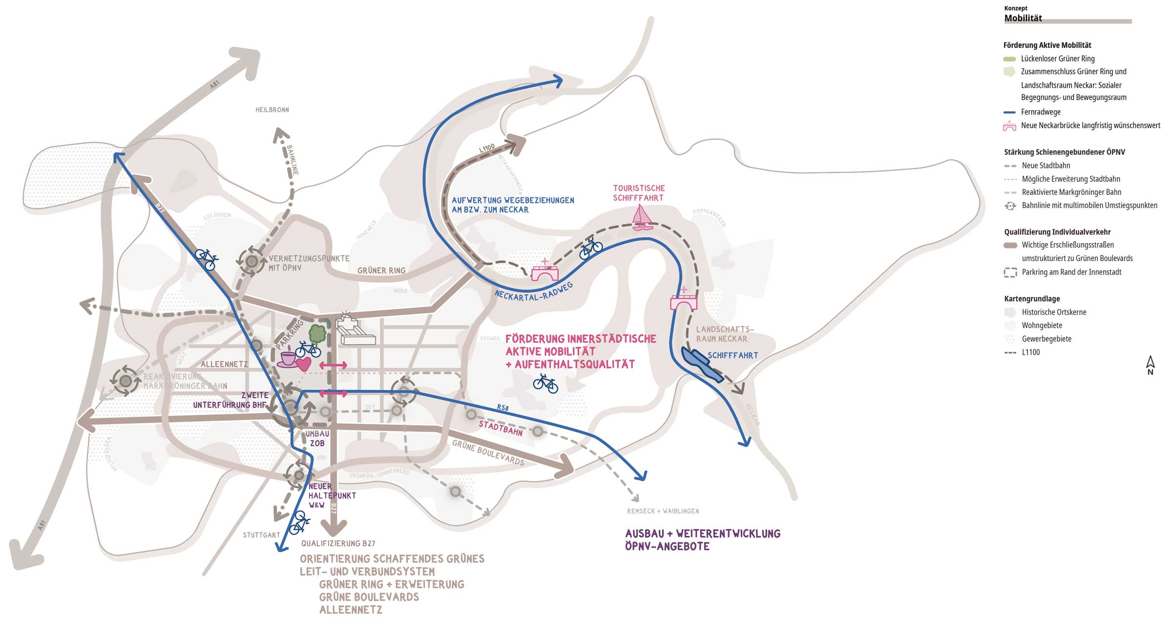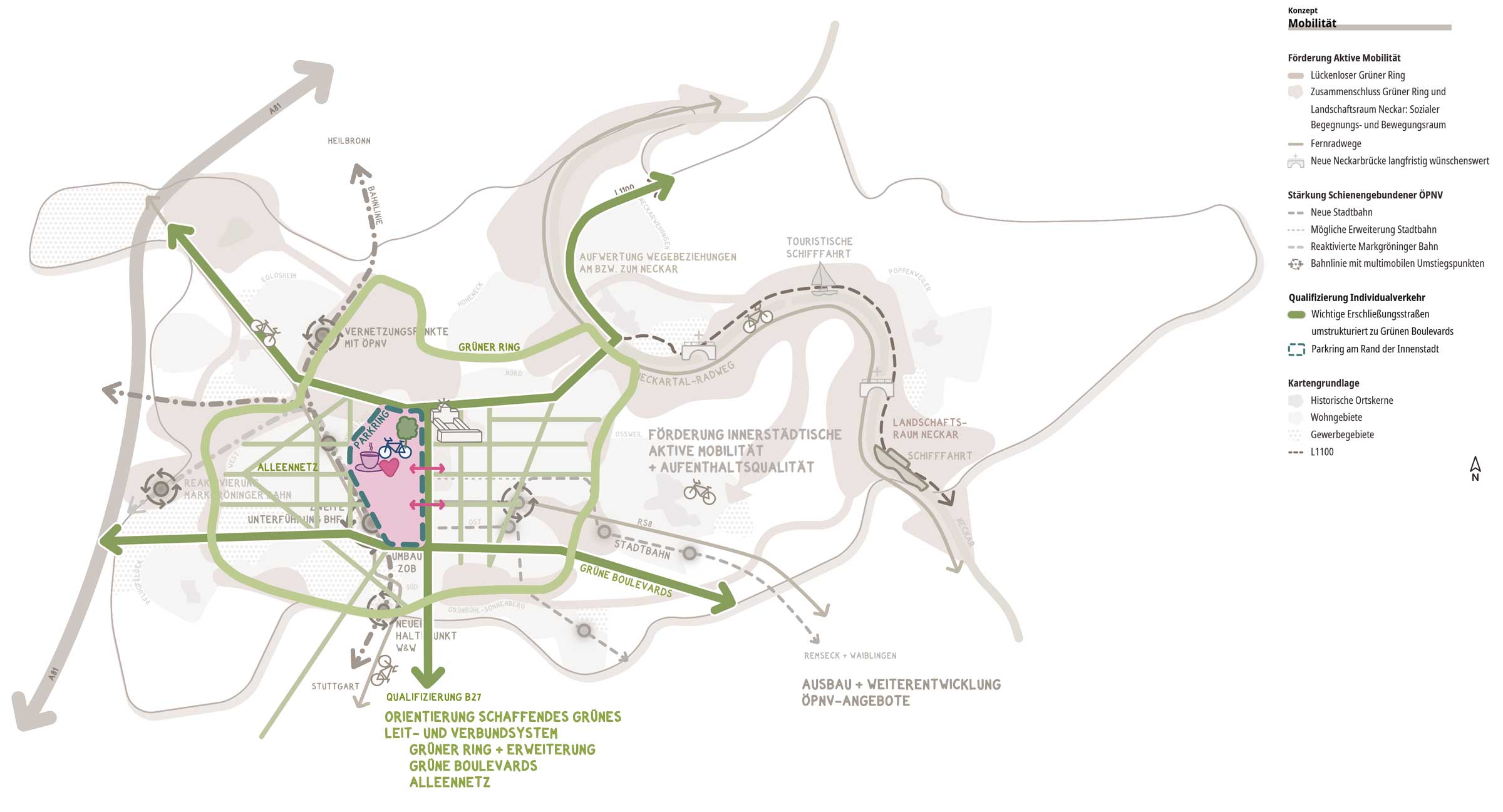 Klicken Sie auf die Legende, um das Zielkonzept im Detail zu erkunden. Die För­de­rung der ak­ti­ven Mo­bi­li­tät ver­folgt zwei zen­tra­le Zie­le: Ers­tens die Ent­wick­lung at­trak­ti­ver Ver­netz­ungs­mög­lich­kei­ten des ak­ti­ven In­di­vi­du­al­ver­kehrs mit dem öf­fent­li­chen Per­so­nen­nah­ver­kehr (ÖPNV) an zen­tra­len Stel­len im Stadt­ge­biet. Zwei­tens die Stei­ge­rung der Auf­ent­halts­qua­li­tät. In­ner­halb des Park­rings sol­len Stra­ßen­räu­me zu­gun­s­ten des Fuß- und Rad­ver­kehrs auf­ge­wer­tet wer­den, wo­bei die At­trak­ti­vi­tät und Er­reich­bar­keit der In­nen­stadt und der Par­kie­rungs­an­la­gen be­rück­sich­tigt wer­den müssen.  Zen­tra­les Ziel im Be­reich der Mo­bi­li­tät ist der Aus­bau bzw. die Wei­ter­ent­wick­lung der ÖPNV-An­ge­bo­te: Hier geht es z.B. um den Um­bau des Zen­tra­len Om­ni­bus­bahn­hofs, den Bau der zwei­ten Un­ter­füh­rung, den Bau der Stadt­bahn, der Mark­grö­nin­ger Bahn, ggf. auch um den Bau ei­nes neu­en Hal­te­punkts W&W (Schus­ter­bahn). Im Bereich der B27 soll un­ter­sucht wer­den, wie die Auf­ent­halts­qua­li­tät in die­sem zen­tra­len Stadt­raum ge­stei­gert, die Bar­rie­re­wir­kung ver­min­dert und der Al­leen­cha­rak­ter ge­stärkt wer­den kön­nen. Gleich­zei­tig müs­sen aber auch die ver­kehr­li­chen Be­lan­ge be­rück­sich­tigt werden.