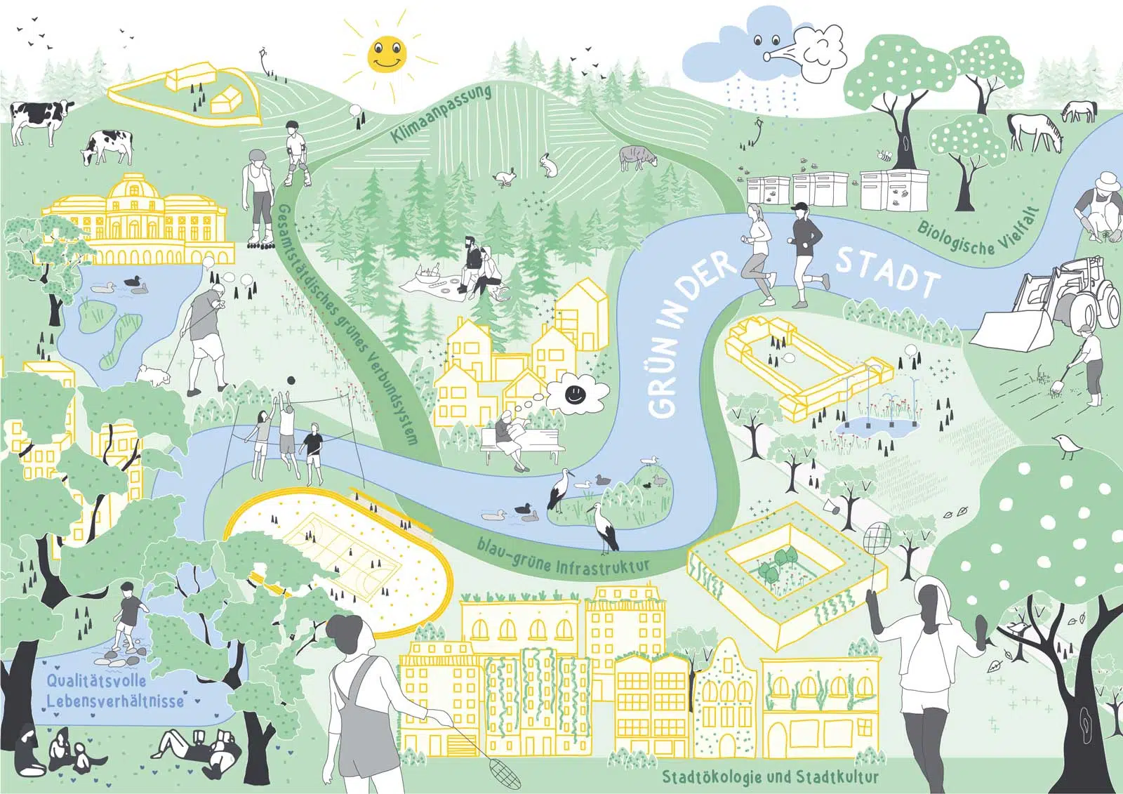Wir schaffen in Ludwigsburg im Bereich der biologischen Vielfalt und der Klimaanpassung eine zukunftsfähige Grundlage für qualitätvolle Lebensverhältnisse. Basis hierfür ist eine blau-grüne Infrastruktur, die als gesamtstädtisches Verbundsystem den zukünftigen Anforderungen gerecht wird. Es entsteht ein Grünes Netz aus Freiräumen, geprägt von eigener Charakteristik, bei der Austausch und Verbindung Kernziele der Stadtökologie und Stadtkultur darstellen.