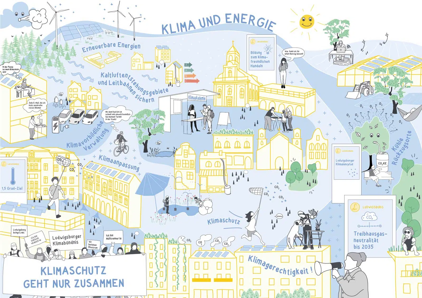 Die Stadt Ludwigsburg ist im Jahr 2035 treibhausgasneutral. Der Treibhausgasausstoß der Stadt Ludwigsburg muss dafür schrittweise gemindert werden. Die Bevölkerung, Unternehmen, Vereine und sonstige Institutionen wissen durch Kommunikationsmaßnahmen sowie Beratungs- und Bildungsangebote, wie sie klimafreundlich handeln.