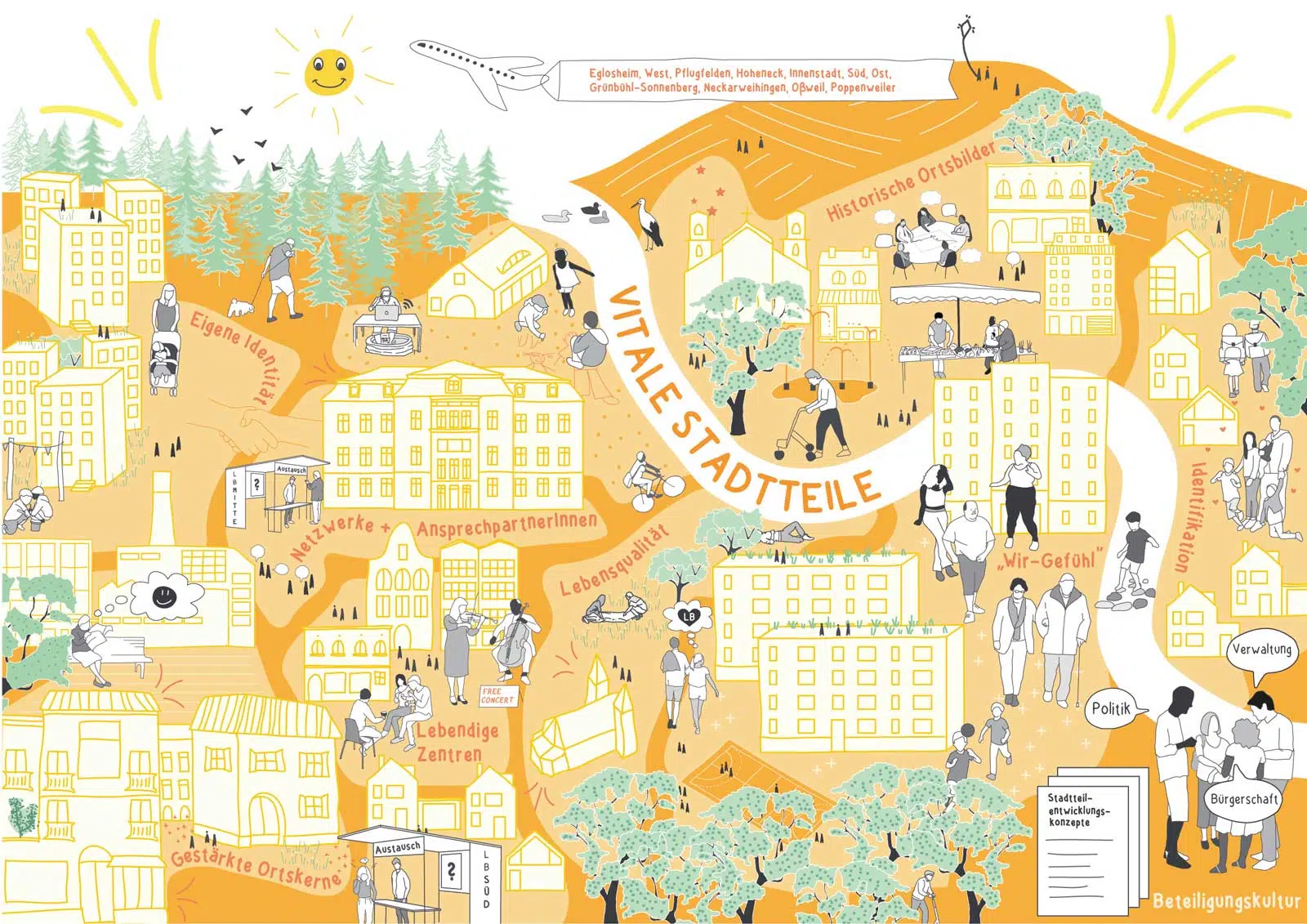 Die Stadtteile werden im Trialog mit der Bürgerschaft, der Verwaltung und der Politik weiterentwickelt. Grundlage dafür ist eine wertschätzende und zielorientierte Beteiligungskultur.